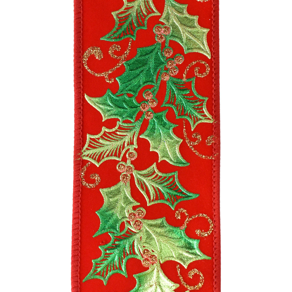 Add your own personal touch to any project! This ribbon features a beautiful red velvet flocked fabric with metallic holly leaves embossed for the perfect addition to any indoor Christmas home decor, DIY projects, or any other crafting needs. Take your decorating or DIY to the next level! Note: Contains wire Length: 10 yards Width: 2.5"