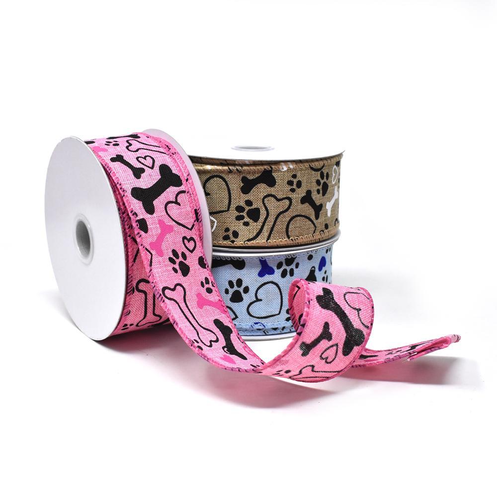 We all know dogs are everyone's best friend! This adorable wired ribbon features an array of dog paw prints, dog bones, and hearts all on linen.
