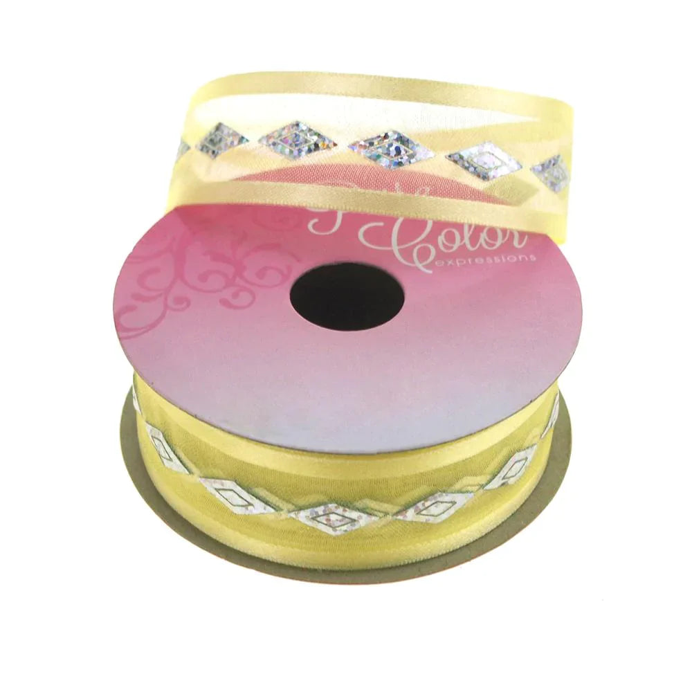 This sheer ribbon is light-weight and has a harlequin diamond bling on the center that creates a iridescent shine.