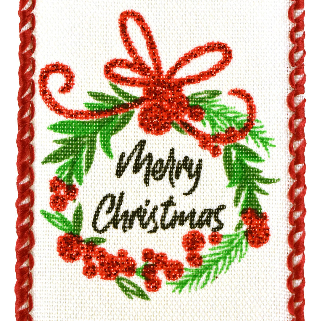 Merry Christmas Wreath Faux Linen Wired Ribbon, 1-1/2-inch, 10-yard
