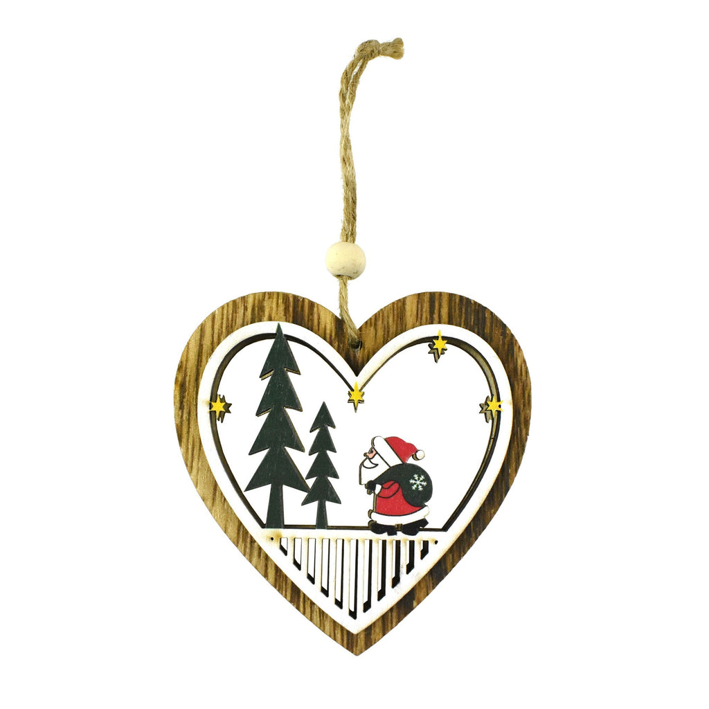 Give the cutest and most festive holiday accent to your home or office with this unique set of heart-shaped wooden ornaments. Each ornament features a silhouette of cute little Santa Claus and snowmen, who are ready to celebrate the season. Perfect for decorating your tree or decking the halls! Pack: 2 ornaments Length: 3.5" Width: 3.5"