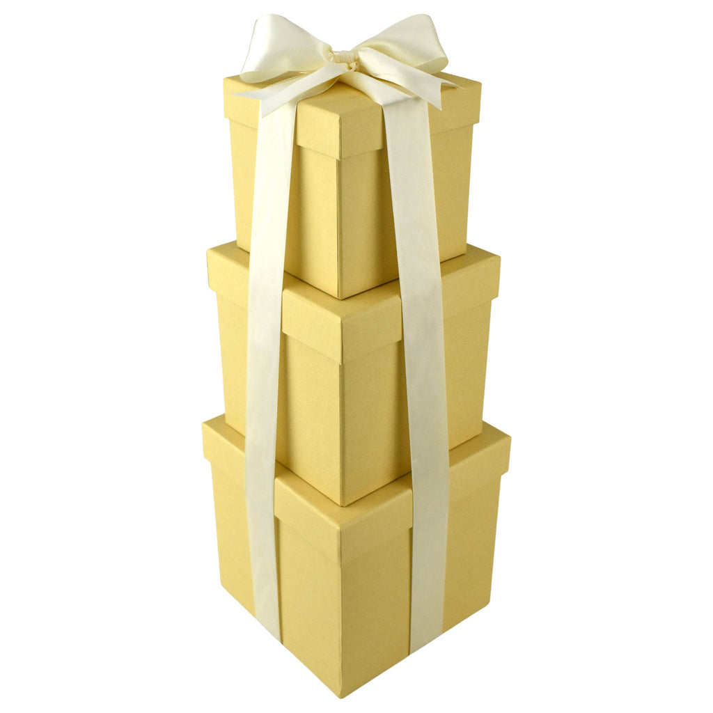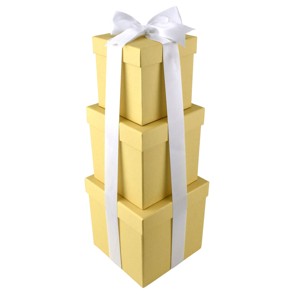 Our Nested Gift Boxes are crafted with attention to detail, featuring a set of multiple boxes that fit perfectly inside one another. To add a touch of elegance, each set of nested boxes features luxurious satin ribbon, providing a soft and lustrous texture and creating an enticing visual contrast against the smooth surface of the boxes. Use them individually or stack them together to create an impressive and visually appealing gift presentation that will leave your recipient in awe! Pack: 3 boxes (1x 5" box, 1x 6" box, 1x 7" box), 10 yds of single faced satin ribbon