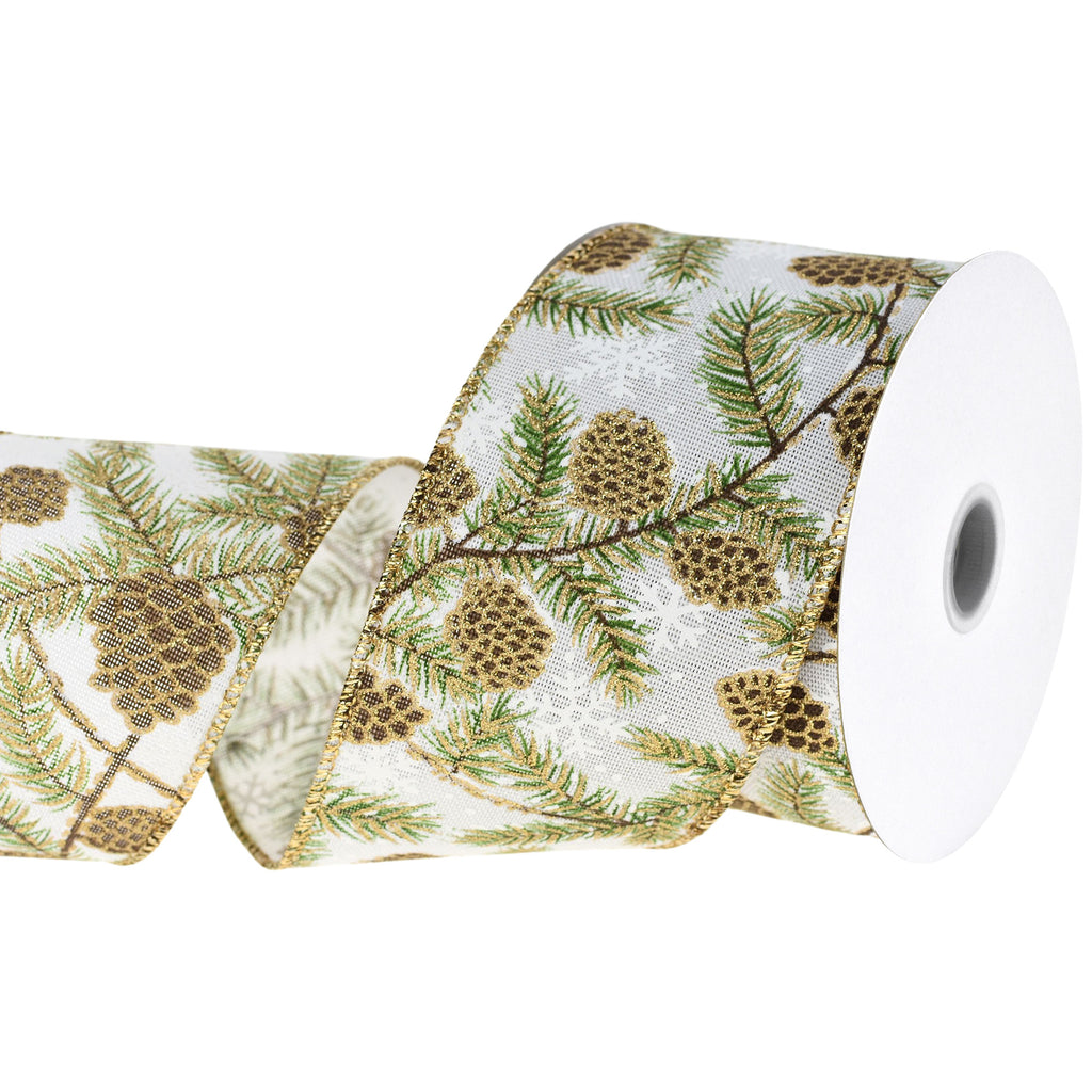 Christmas Glittered Pine Cones Faux Linen Wired Ribbon, 2-1/2-inch, 10-yard