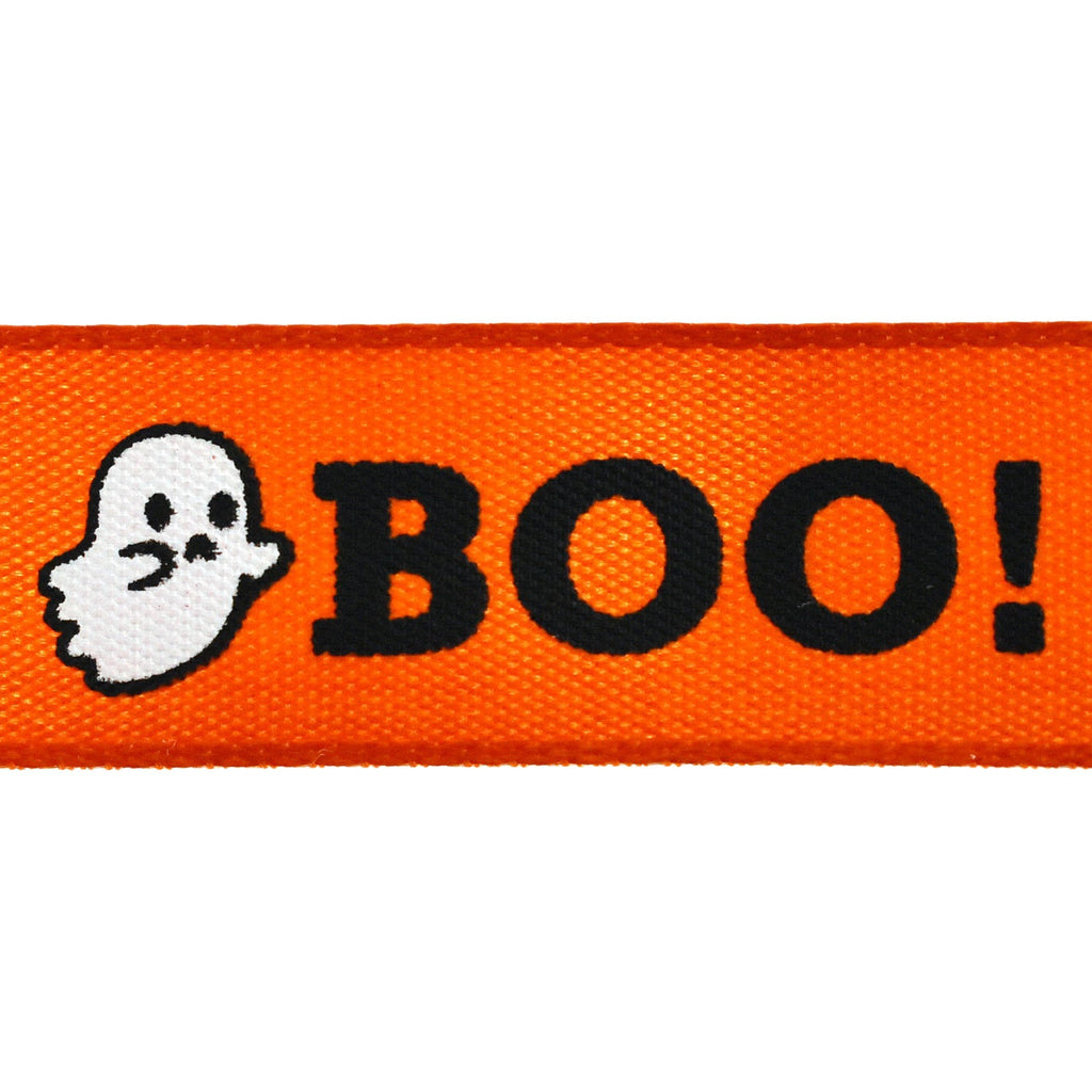 Add some spooky fun to your Halloween decorations with this cute ribbon! This ribbon features an adorable cartoon ghost in an orange satin canvas with the words 'Boo!' and 'Spooky' all over. Perfect for gift wrapping, these ribbons are also a great way to decorate your home or treat bags during the Halloween season. Note: Does not contain wire Length: 10 yd Width: 0.625"