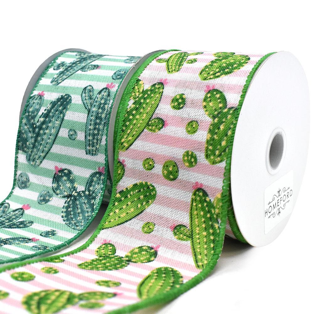 Add your own personal touch to any project! This ribbon features a linen fabric with a striped background and patterns of cacti and succulents. Take your decorating or DIY to the next level! Note: Contains wire