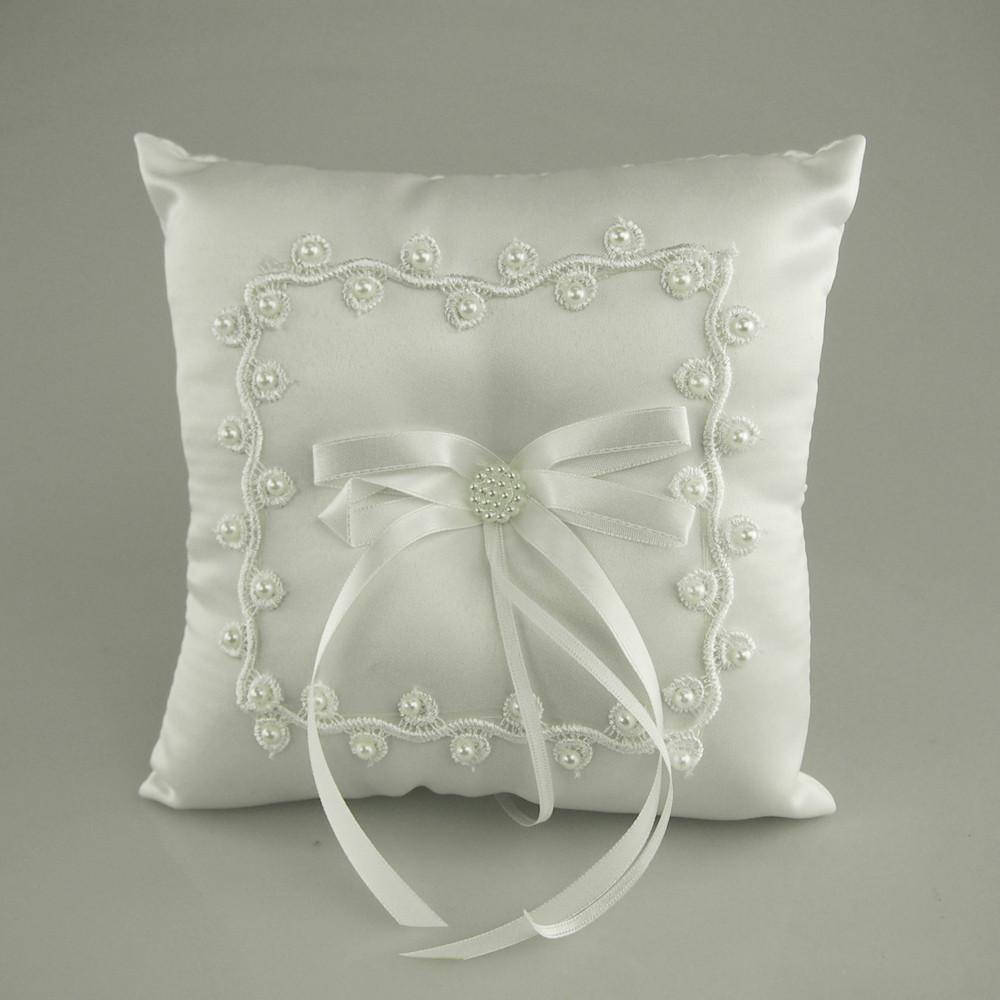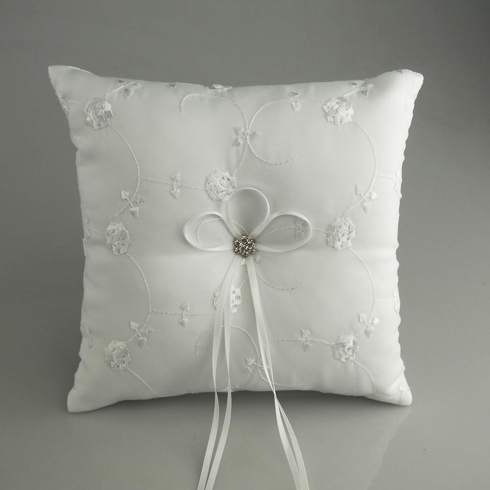 A fancy white pillow, fluffy, and soft to the touch. This pillow can be used as a ring bearer pillow for weddings, bridal showers, anniversaries and the like.