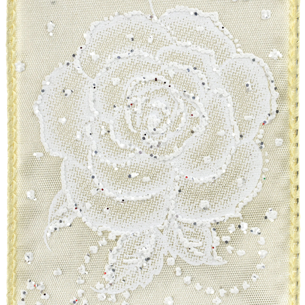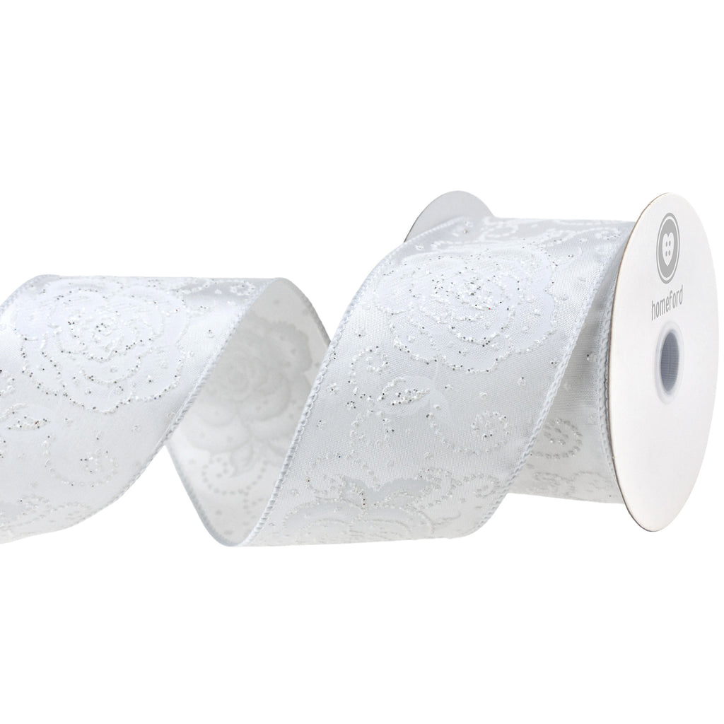 Glittered Wedding Rose Pattern Satin Wired Ribbon, 2-1/2-inch, 10-yard
