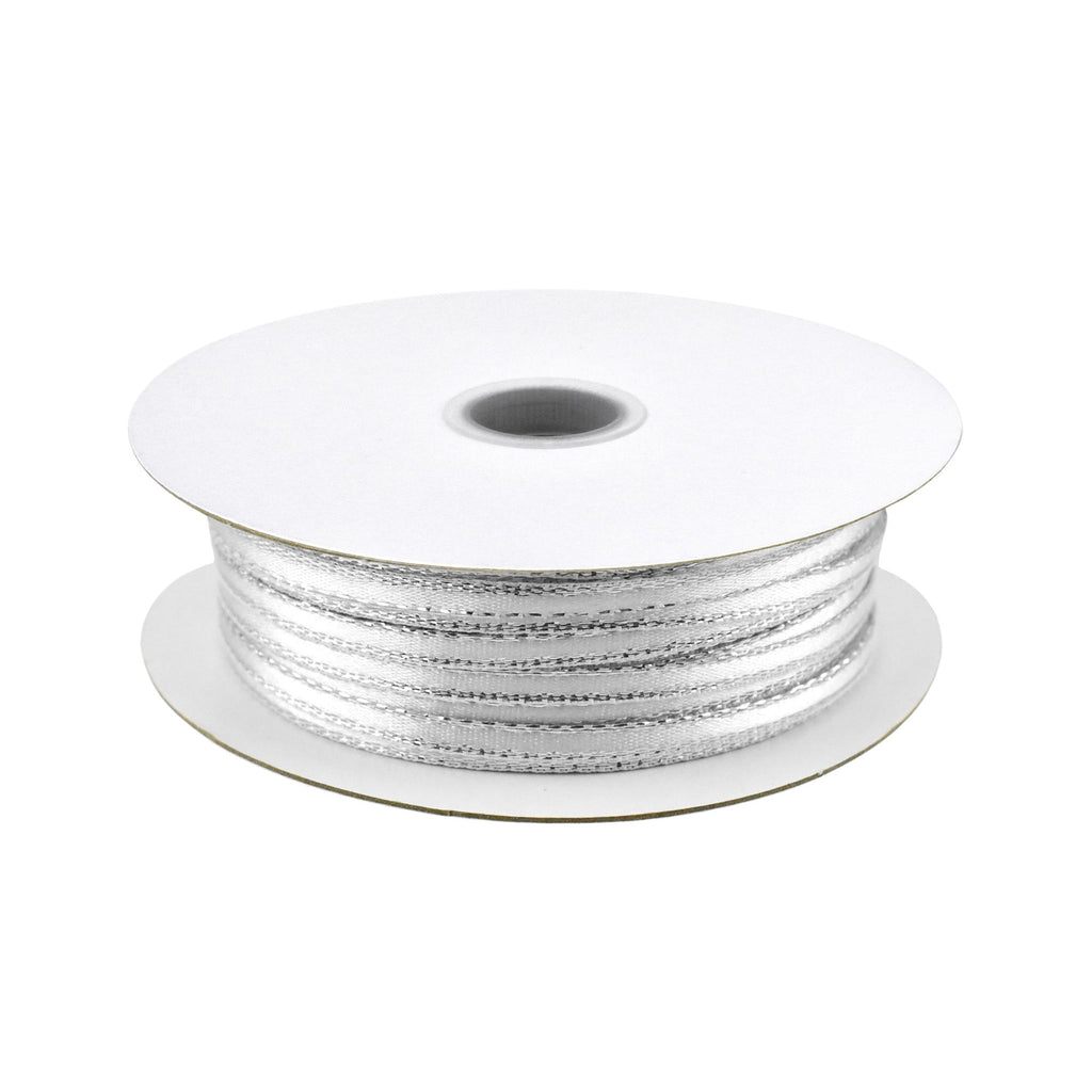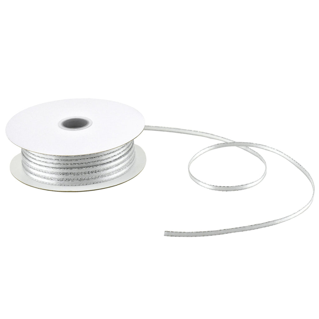 Single face satin ribbon with a sparkling silver metallic trim edge are perfect for gift wrapping and crafting. It's a great quality ribbon and ideal for birthdays, baby showers, garments, packaging, bridal and wedding use as well as arts and crafts and scrap-booking! Add the perfect finishing touch for your decorating, DIY projects, gift giving, and more!