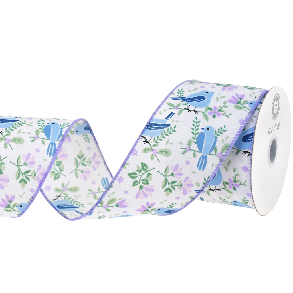 Spring Birds Flower Stems Satin Wired Ribbon, 2-1/2-inch