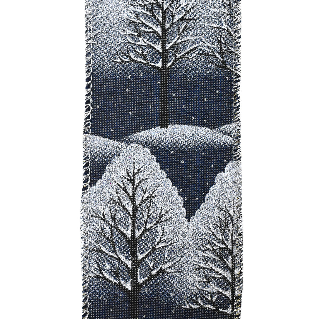 Glitter Silver Winter Trees Faux Linen Wired Ribbon, 2-1/2-Inch, 10-Yard - Navy Blue