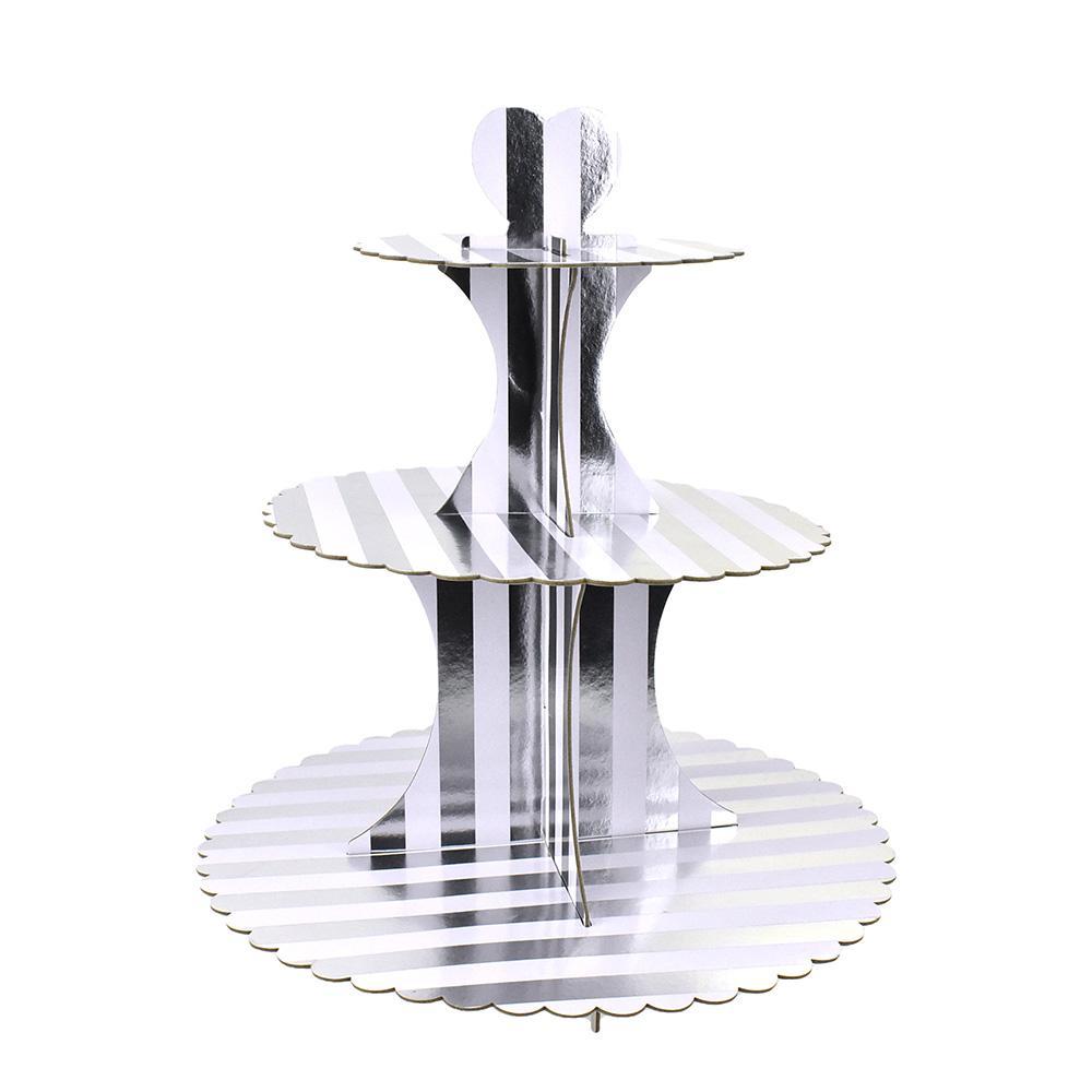 Present your cupcakes in style with this beautiful 3-Tier Cupcake Stand. Features a sturdy cardboard material in a gold or silver and white stripe pattern. The ideal way to serve up cupcakes and other delicious treats for any celebration. Easy to assemble and stores flat for convenience. The stand fits 12 regular cupcakes.