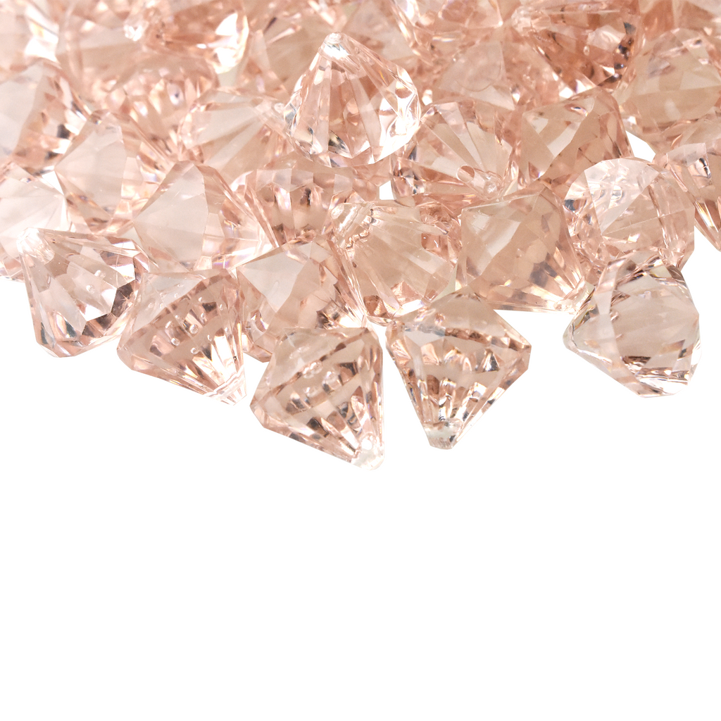 Add some sparkle to your decorations or DIY projects with these acrylic diamonds. These plastic gems are perfect for scattering on tables or filling vases to create tunning centerpieces. They each have holes so they can be hung and displayed anywhere. Diamond Length: 1" Diamond Width: .75" 100 Pcs.
