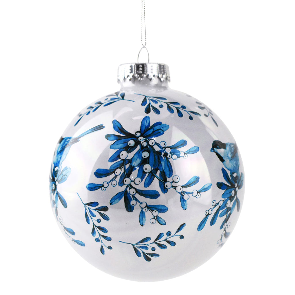Decorate your Christmas tree or mantelpiece with these festive glass ball ornaments that feature bluebirds and branches. Their lovely, porcelain-style pattern will fit perfectly in any setting and complete a elegant and beautiful aesthetic. Perfect for holiday and special occasions, these versatile glass baubles are the perfect addition to your home decor! Pack: 2 pcs Ornament Diameter: 3.5"