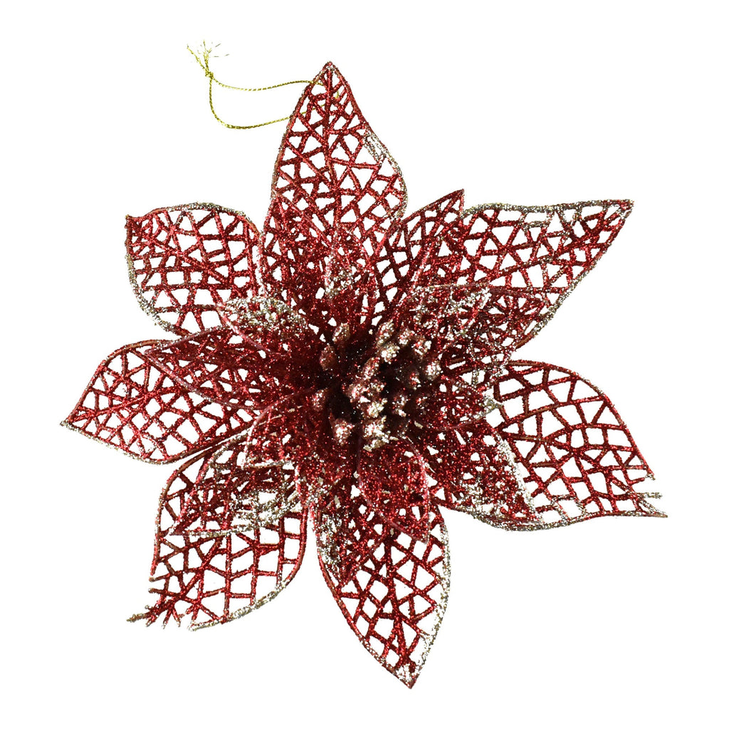 Add a special touch of holiday charm to your Christmas tree with these glittered poinsettia hanging ornaments! The each poinsettia flower are each made of shiny metallic glitter, making them perfect for adding some sparkle to your Christmas décor. Hang them around the tree or around the house for a festive touch! Pack: 4 ornaments, Diameter: 7.5"