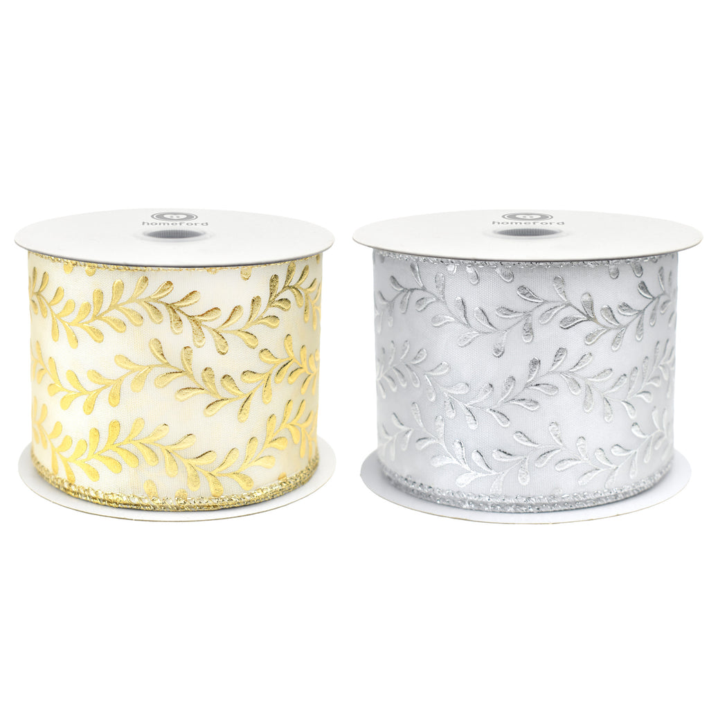 Christmas Metallic Embossed Vines Satin Wired Ribbon, 10-yard