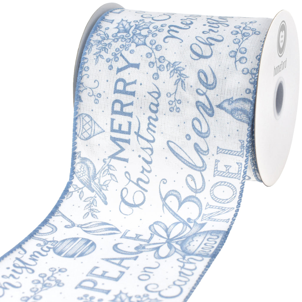 Christmas Vintage Script Faux Linen Wired Ribbon, 4-inch, 10-yard