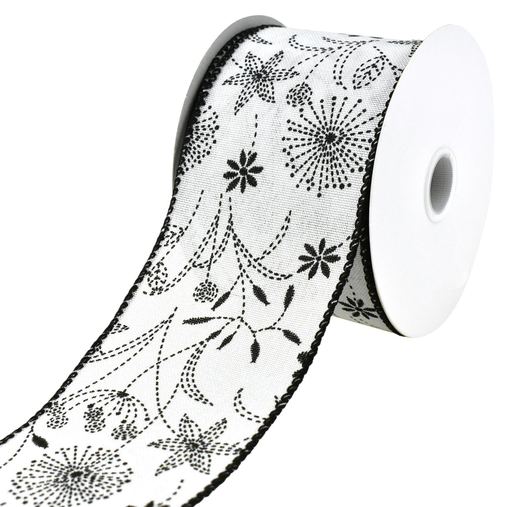 Doodle Flowers Faux Linen Wired Ribbon, 10-yard