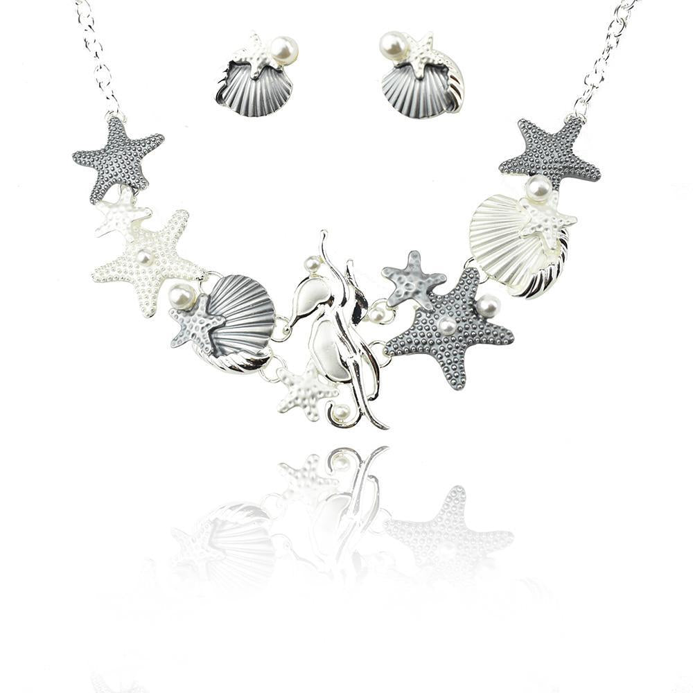 LOVELY NECKALACE SET- This beautiful necklace features a seahorse with seashells, starfishes, and pearls, which makes it look more unique and eye-catching. Pair this necklace with matching earrings.