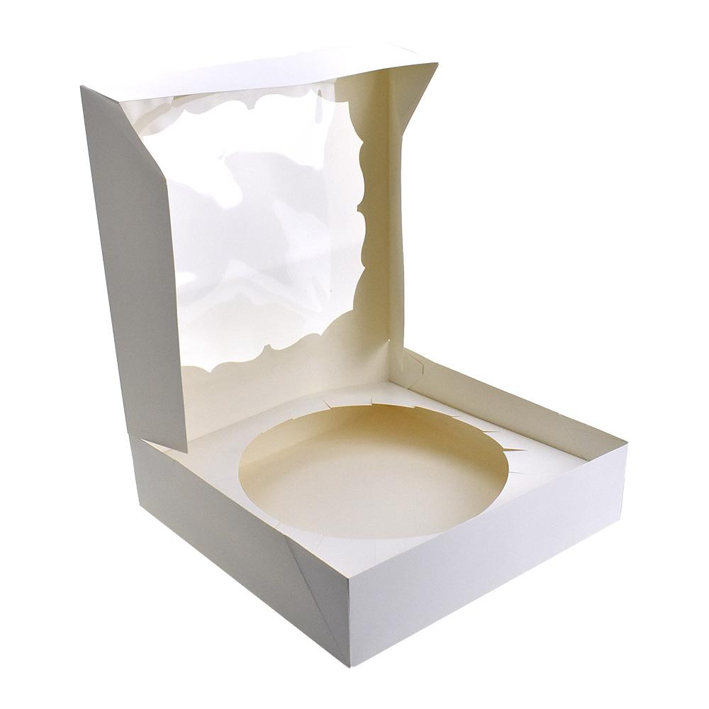 The paper box has a classic white design with a transparent film on the top side of the box. This product is also disposable making for easy clean up. Each order comes with one paper pie box and paper pie insert, to keep pies stable.