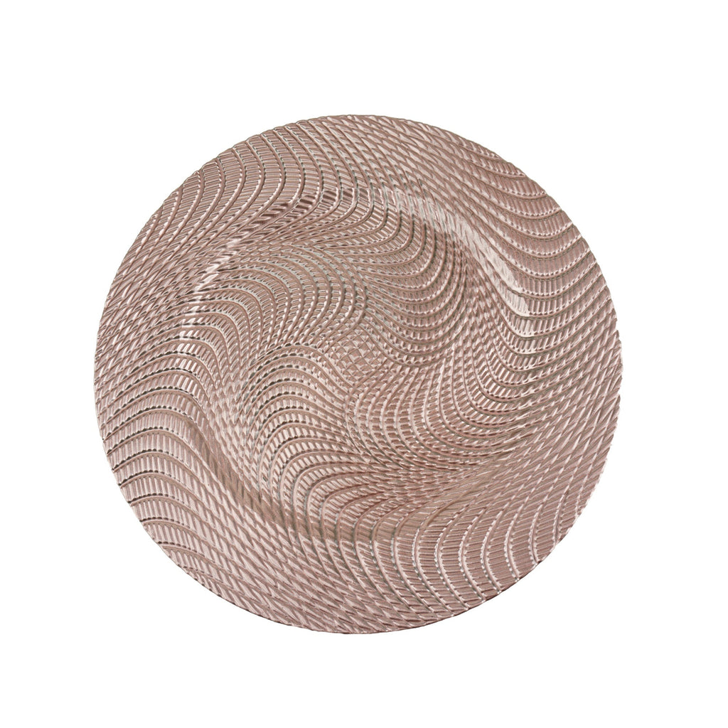 Decorate your next party or event with this textured swirl charger plate! These charger plates will be elegant decorations for your next event or party. These plates are great for weddings, birthdays, Thanksgiving and other holidays. Features a a round plate with a square textured swirl pattern in the colors gold, rose gold or silver. Diameter: 13" Height: 0.75"