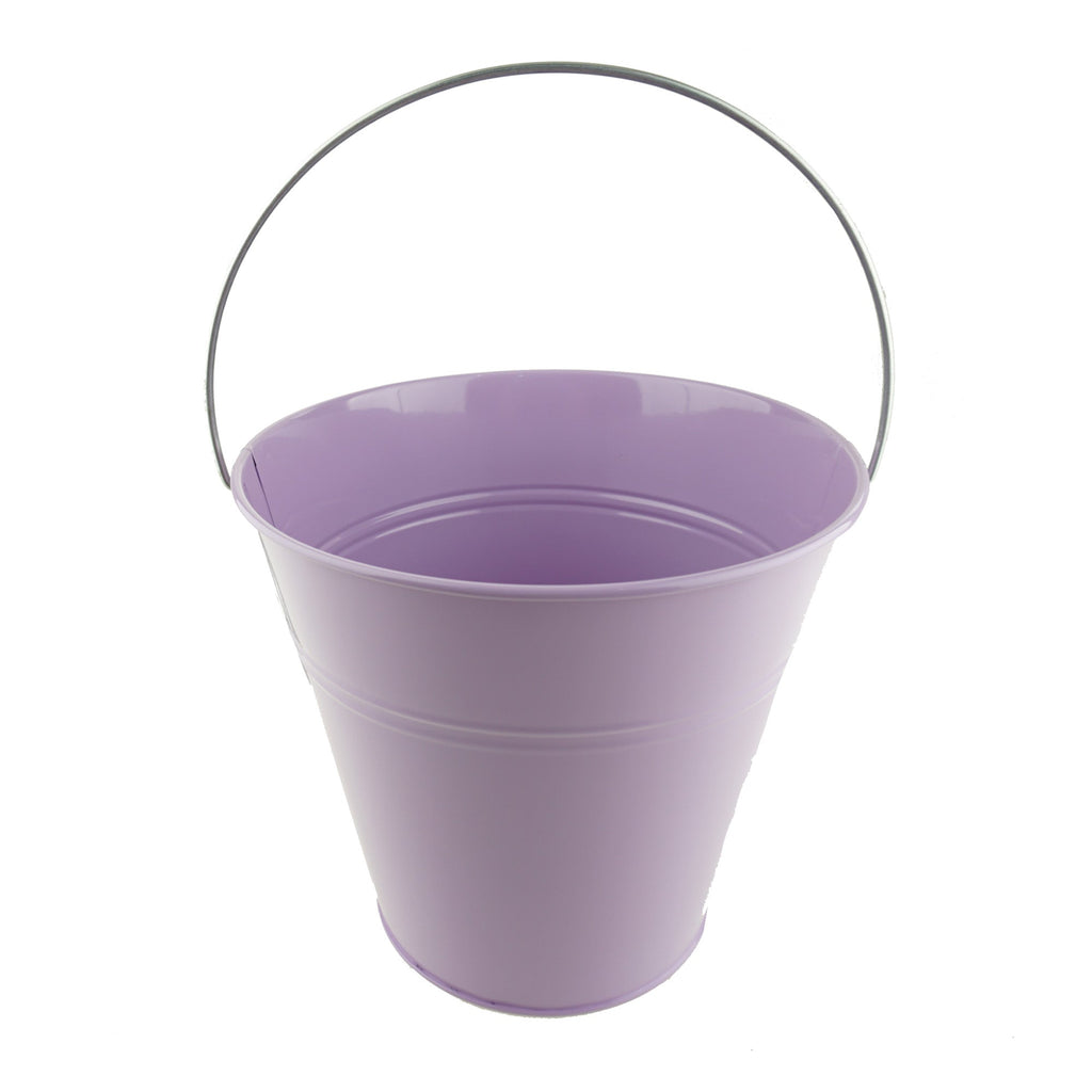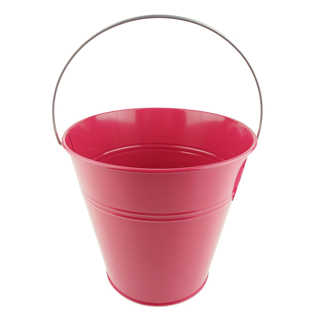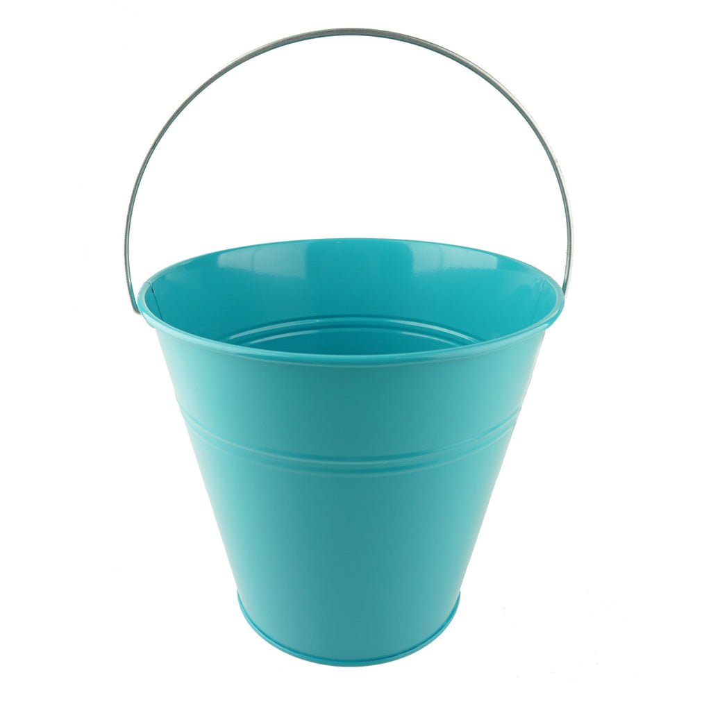 Create a multitude of party decorations or DIY projects with these tin pails with handles! These great pails will be amazing for arts and crafts, gift baskets, Easter egg buckets, holiday decorations and much more. This pail is also great for children and adults to use for activities such as gardening or creating floral arrangements. Features a silver handle and a tin pail bucket in 16 different colors. Height: 9" Height of bucket with handle raised: 14.5" Diameter of opening: 9.5" Diameter of bottom: 6.125"