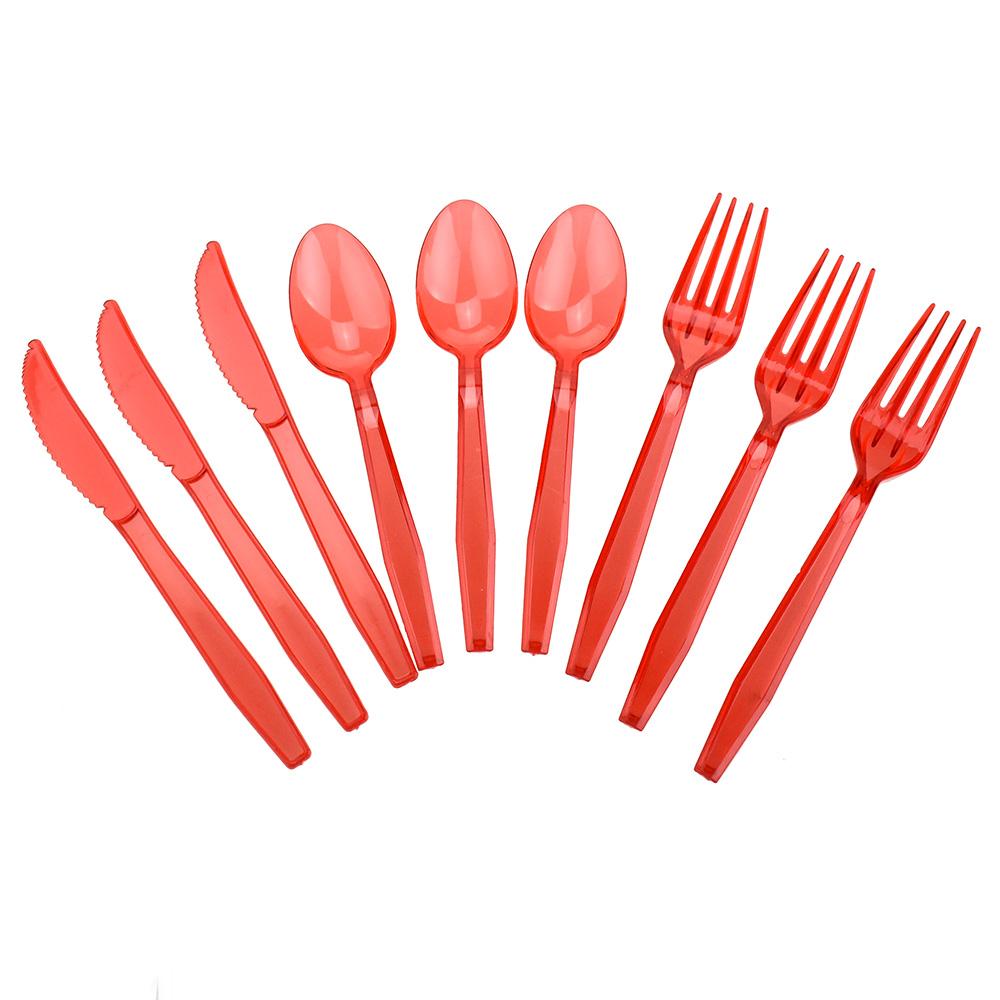 The pretty colors are great for any season or theme. Features transparent cutlery in a red, yellow, blue, pink or clear color. Each pack comes with 8 knives, 8 forks and 8 spoons all in one color. Knife Length: 6.5" Width: 5/8" Spoon Length: 5-7/8" Width: 1.25" Fork Length: 6.5" Width: 1"
